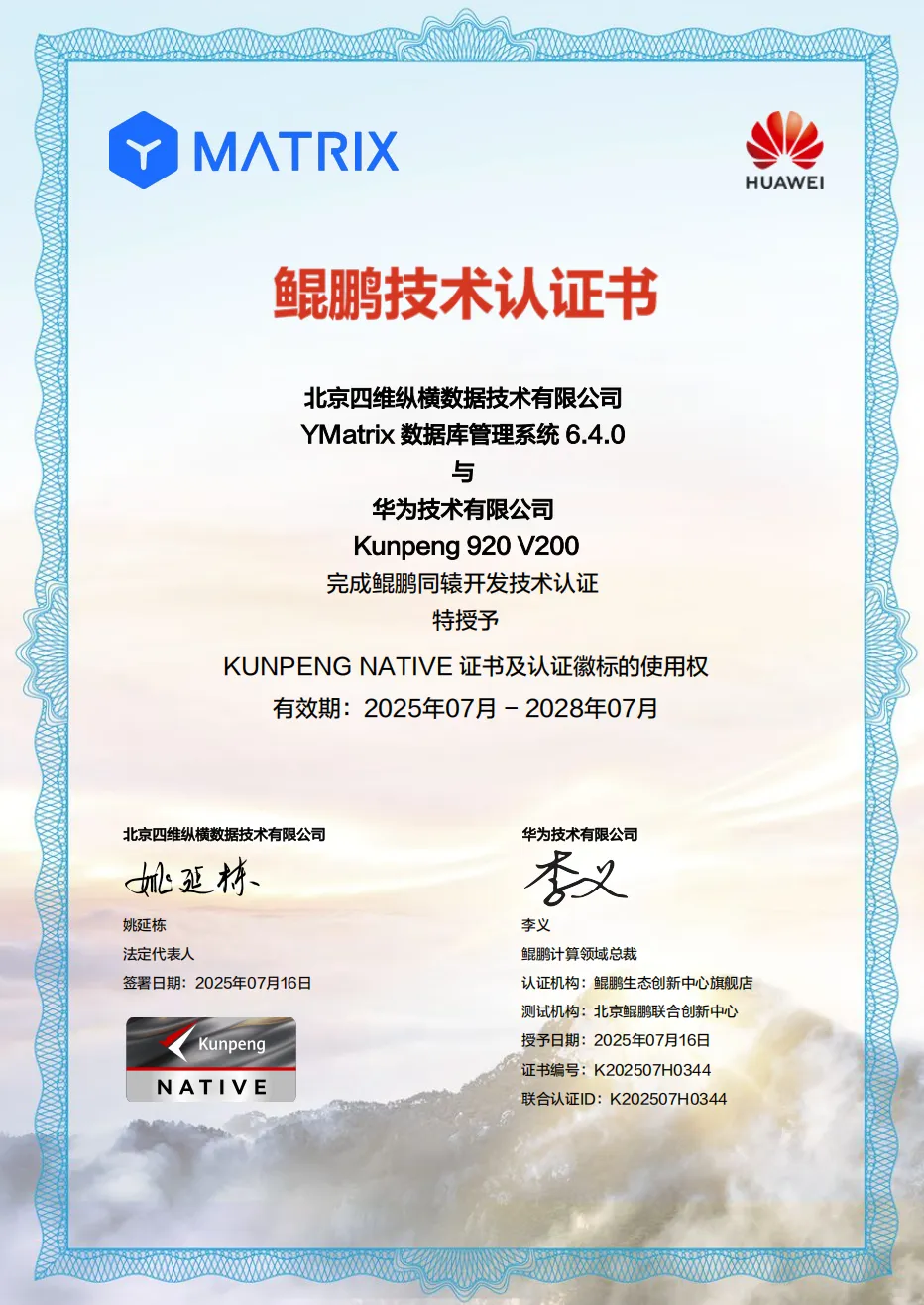 近日,YMatrix 超融合数据库成功通过华为鲲鹏 Native 原生开发技术认证。