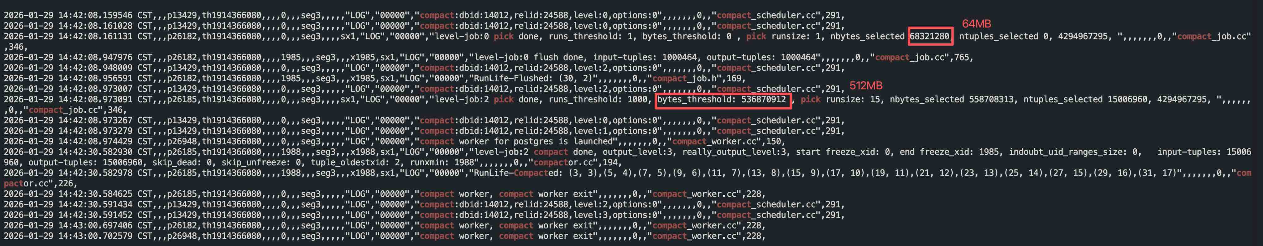 因此不难理解,amplifier 更大,每层能堆更久,run 更可能变多,导致查询检查更多对象 (读放大),但 compaction 触发少 (写更快),amplifier 更小,更早触发下沉整理,run 更少更整洁,读更快,但是 compaction 更频繁。rowstore_size 和 level_size_amplifier 两者合在一起,形成一个可控的下沉节奏,用来在 Tiered 模型下约束 run 堆积,从而限制读放大,同时尽量保留写吞吐优势。更多细节参照7.2 可观测性