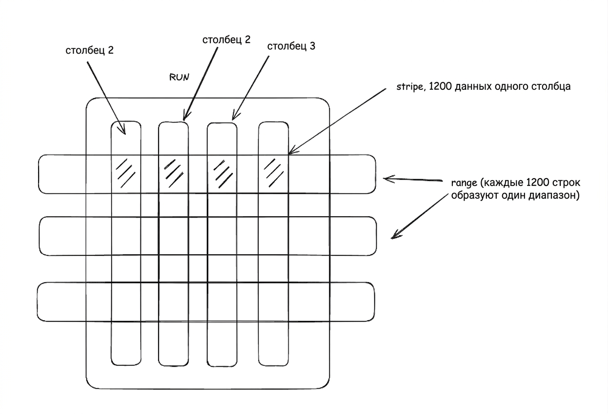 Далее для оптимизации чтения и сжатия они преобразуются в ColumnStore‑Run (колоночный).