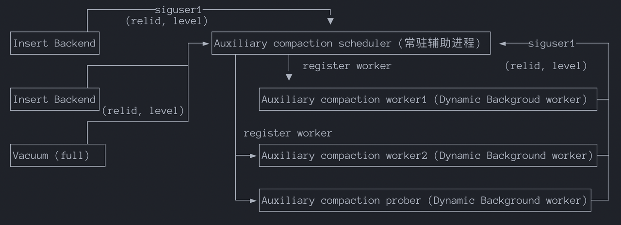 3. Sends SIGUSR1 to the scheduler and writes compaction request information to shared memory: (relid, level).