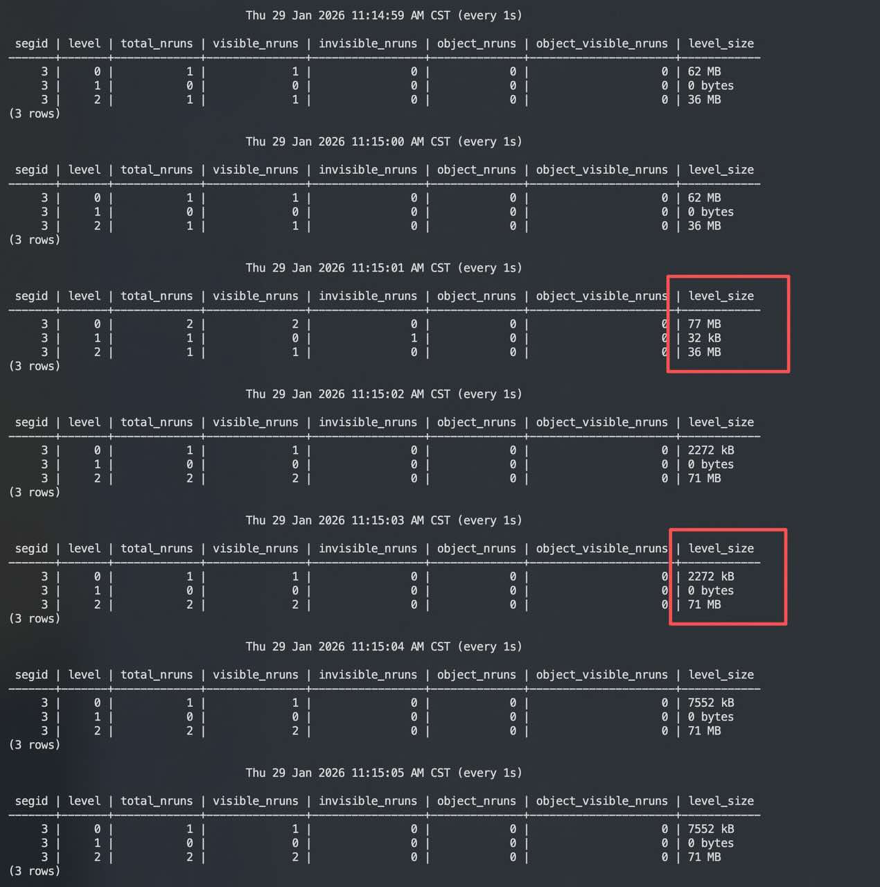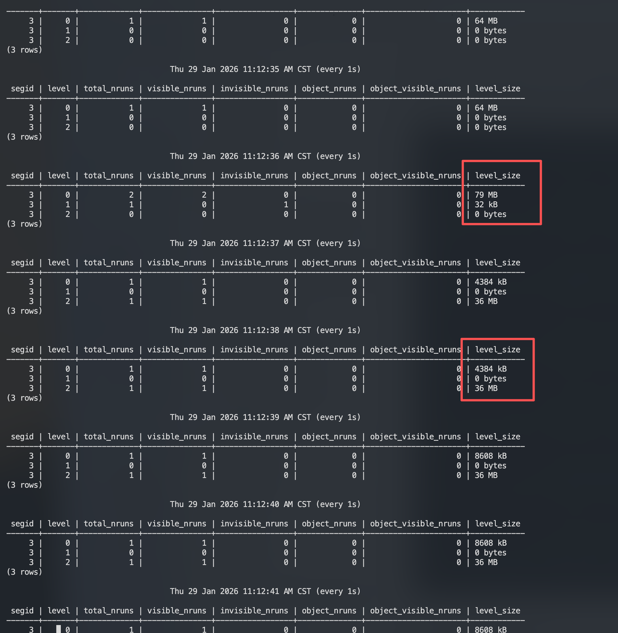 segid | datname | relname | level | nruns | age | bytes | score