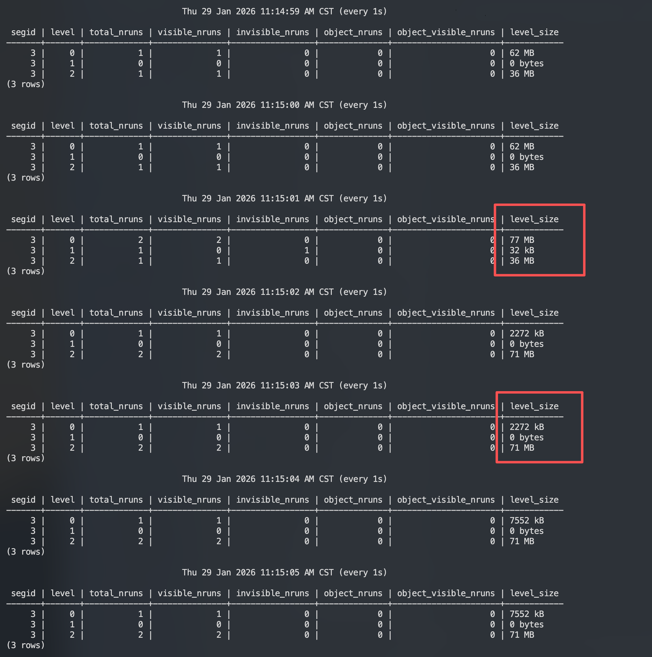 segid | datname | relname | level | nruns | age | bytes | score