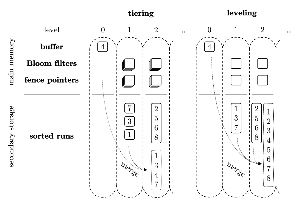 Leveling — каждое уровень поддерживается в упорядоченном состоянии (приоритет чтения). Похоже на немедленное размещение каждого файла по заранее определенным полкам.