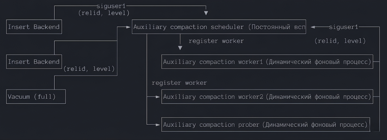 Отправляется сигнал SIGUSR1 планировщику, одновременно в разделяемую память записывается информация запроса на компактизацию: (relid, level)